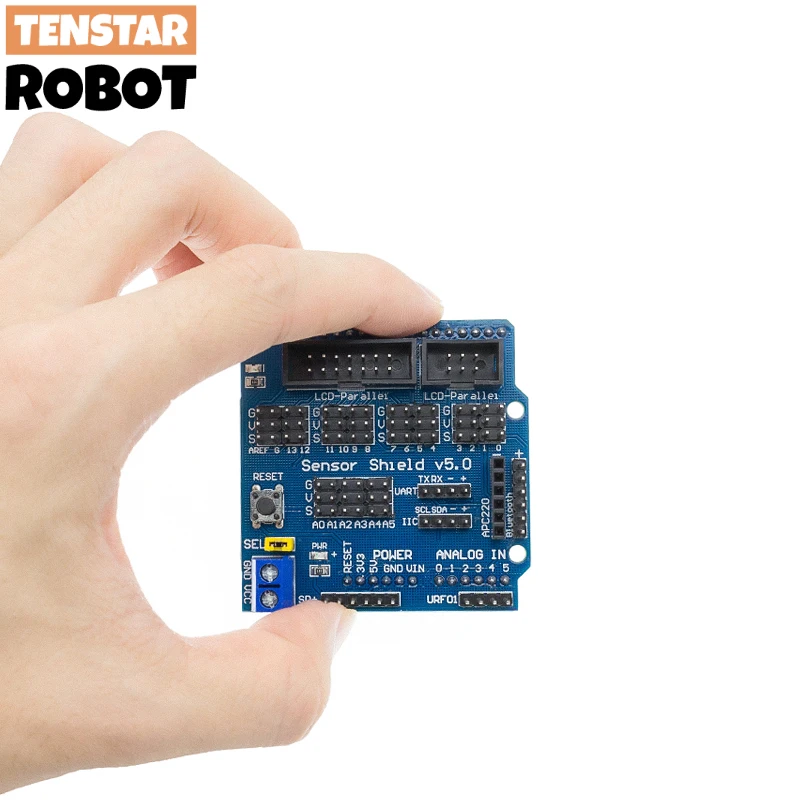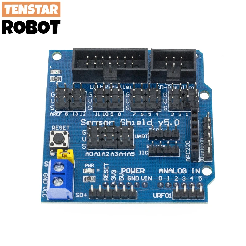 La dernière carte d’extension de capteur Sensor Shield V5.0 n’utilise toujours que la conception de la pile. La carte mère non seulement les interfaces numériques et analogiques UnoAll pour s’étendre hors du formulaire de commande de ligne de direction, mais aussi l’interface IIC ad hoc, interface de contrôleur servo, interface de communication Bluetooth ModuleA, module d’interface de carte SD en communication, interface de communication APC220 RF ModuleA, Capteurs ultrasoniquesInterface, 12864 interfaces LCDSerial et parallèle, expansion indépendante plus pratique à utiliser. Pour les débutants, pas pour la connexion de circuit lourde et complexe et un mal de tête, simplifiera cette carte d’extension de capteur de circuit dans le vrai sens, peut facilement être utilisée pour connecter le capteur, un capteur ne nécessite qu’un câble de capteur 3P commun (quel que soit le câble numérique et le câble analogique), Après l’achèvement de la connexion du circuit, écrivez le programme correspondant au contrôleur Lire les données du capteur, ou recevoir des données de retour du module sans fil, grâce au traitement arithmétique, et finalement facile à compléter vos propres travaux interactifs.